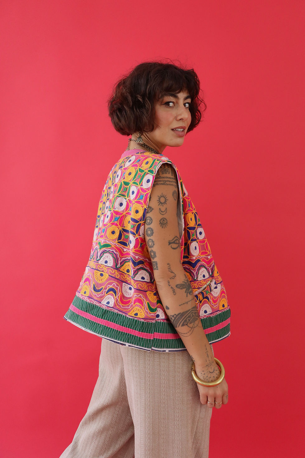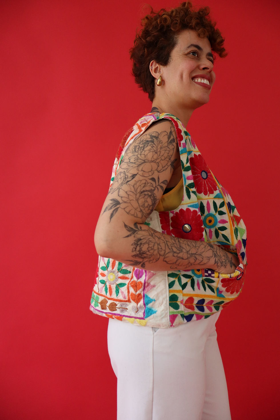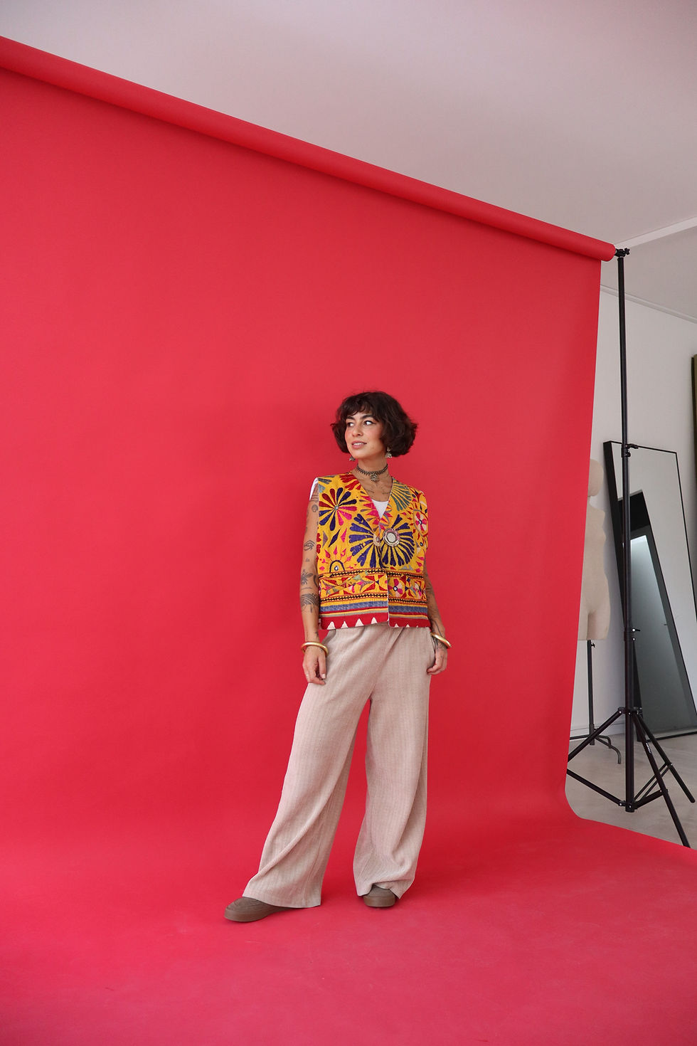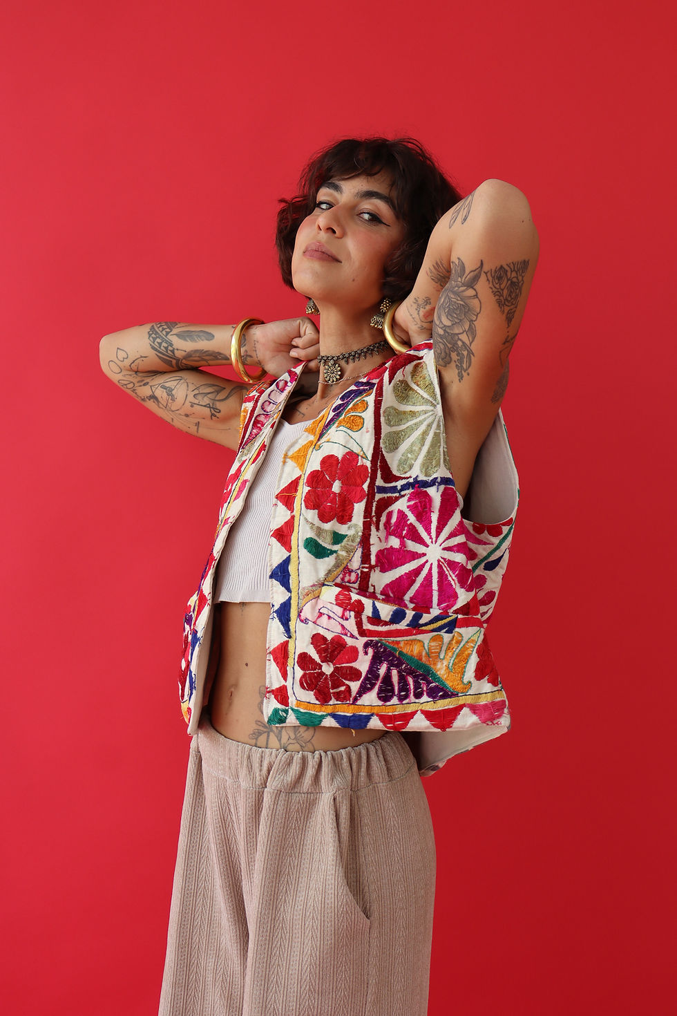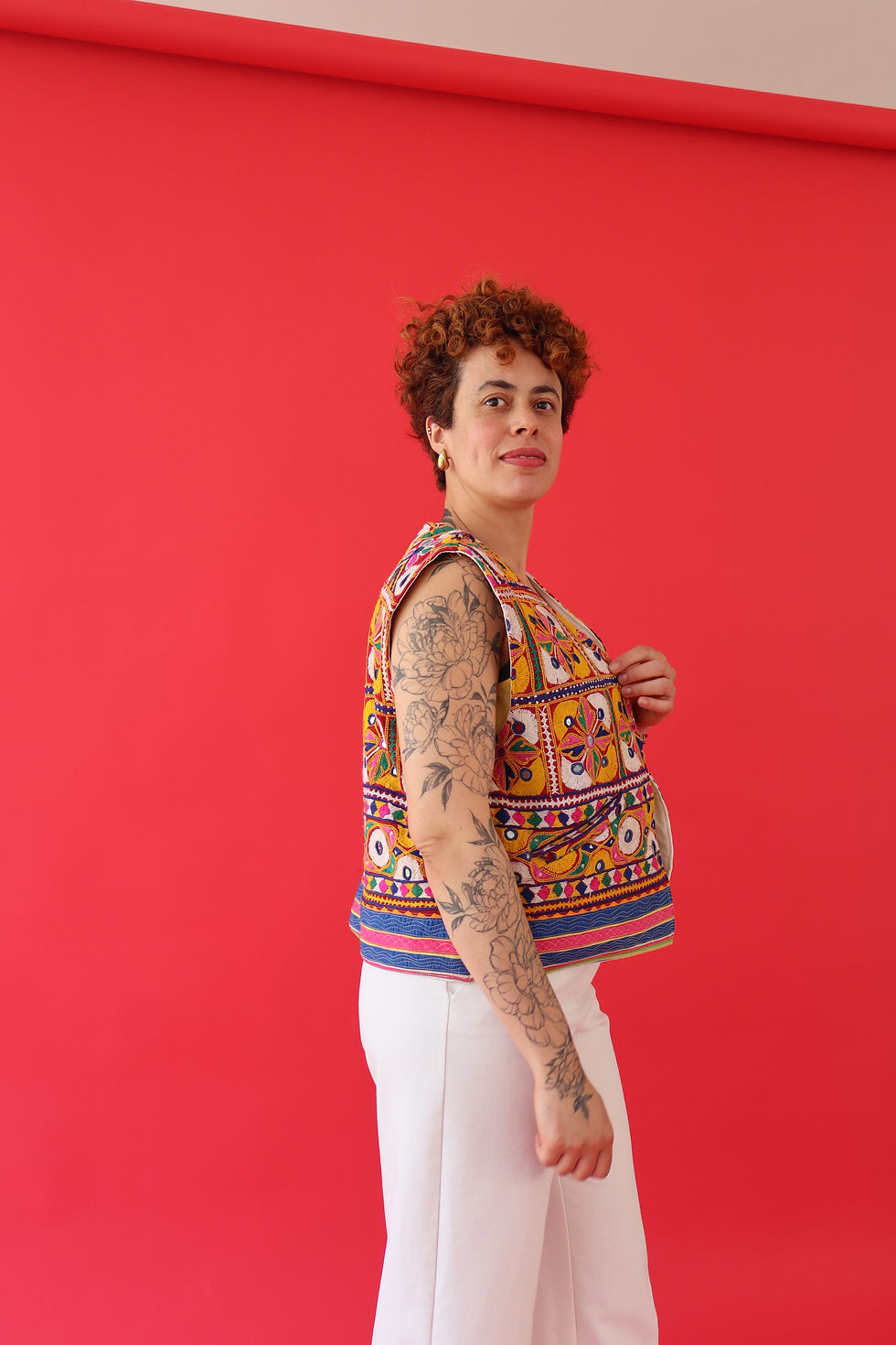 en. open vest with armhole sleeves, with pockets. combined embroidery detail. repurposed old vintage fabrics. handmade in India. one size fits all sizes S - L.
